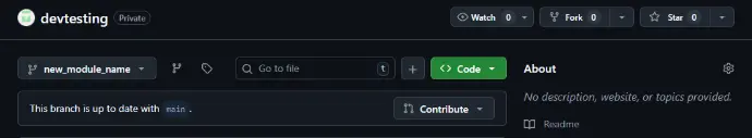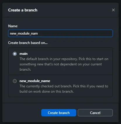 Click New Branch. Name it using the module's technical name for clarity. Click Create Branch.