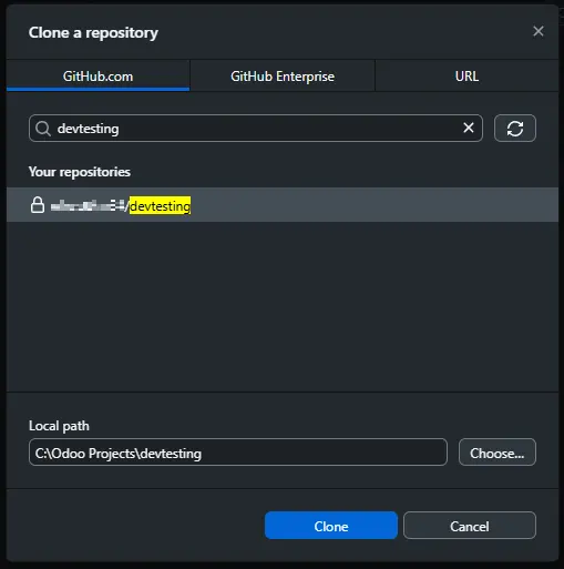 Click File → Clone Repository. Select your Odoo repository from the list and choose a local folder to save it to. Click Clone.