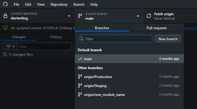 In GitHub Desktop, click the Current Branch dropdown at the top.