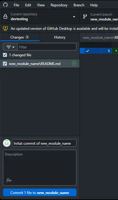 Back in GitHub Desktop, you will see the new module files listed under Changes. Add a summary in the commit message field at the bottom left (e.g., "Add [module name] module"). Click Commit to [branch name].