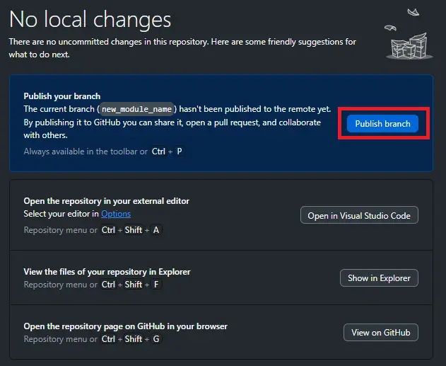 Click Publish branch in the center of the window to upload your changes to GitHub. The branch will now appear in your GitHub repository and Odoo.sh will automatically begin to rebuild.