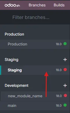 - In your Odoo.sh dashboard, locate your staging branch.