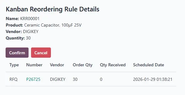 The system creates a purchase order, manufacturing order, or warehouse transfer based on your configuration. You can review and confirm before finalizing.
